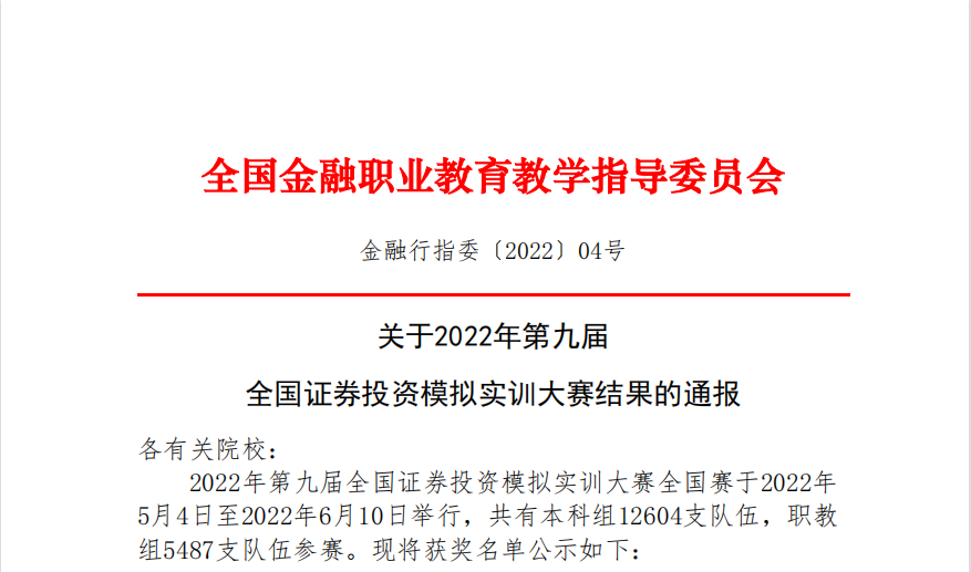 近日,由全国金融职业教育教学指导委员会主办的“2022年第九届全国证券投资模拟实训大赛”圆满落幕,金年会app手机版在线登录学子代表队与近500所高职院校、5400多支队伍进行激烈角逐,最终6支队伍入围各级奖项:1支队伍获得团体二等奖,5支队伍获得团体三等奖。金融系王辉等多名老师荣获“优秀指导教师”称号。全国证券投资模拟实训大赛是以证券业为背景,基于证券从业者所应具备的行业知识、基本业务技能及实操技能等设计的综合实训大赛。此次也是金年会app手机版在线登录继2021年后再获得佳绩。通过本次比赛,参赛学生不仅积累了丰厚的行业知识和社会经验,更是提升了个人的专业技能和职业素养,有效推动了学院金融类专业建设和教学改革,是学院“以赛促教、以赛促学、以赛促改”成果的具体表现和优秀实践。(撰稿/王辉)