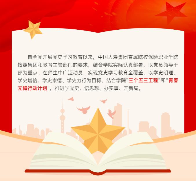 学院党委党史学习教育领导小组办公室及时传达学习中国人寿集团党史学习教育领导小组办公室会议精神和相关文件精神,促进学院党史学习教育实现“六个结合”,即结合全面从严治党、结合各部门年度重点工作、结合各党总支党支部年度党建工作、结合学院党建系列活动、结合调研、结合“我为群众办实事”活动,推进学院党史学习教育走深走心走实。