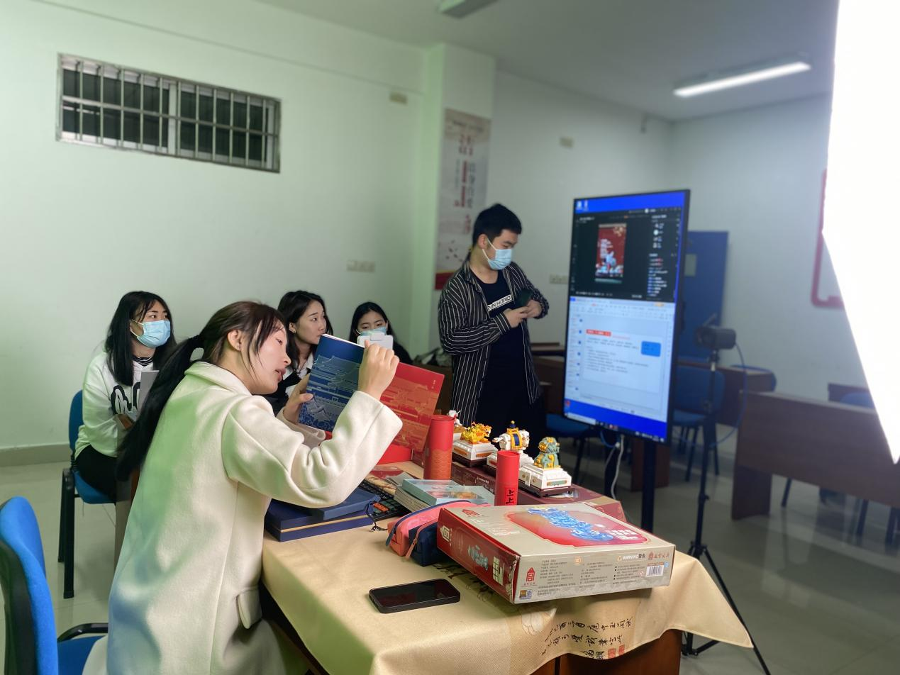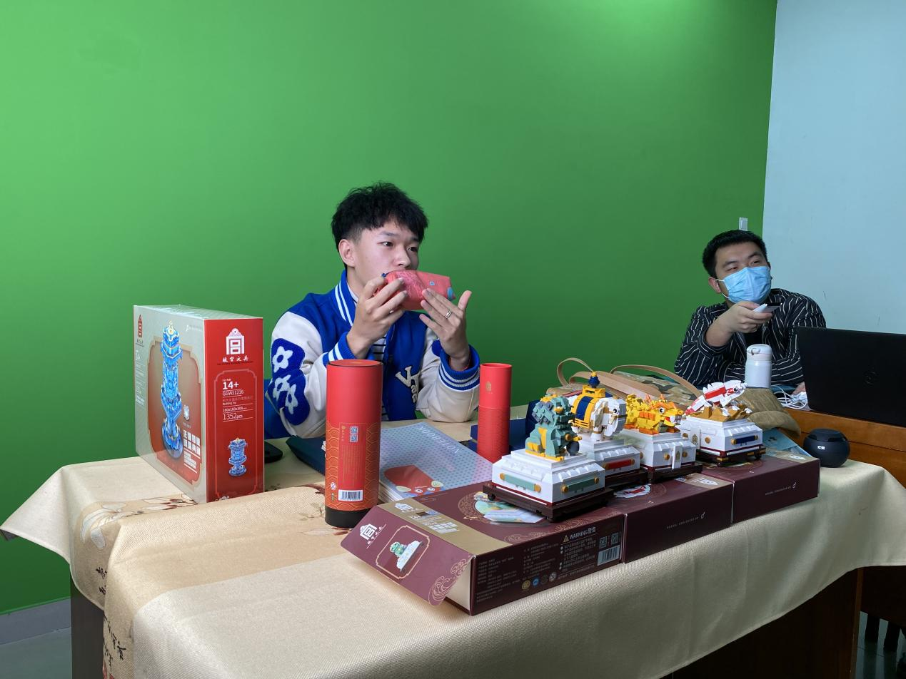 当天,每个“直播教室”都有各式各样的故宫文创产品在直播带货,实习学生主播在直播镜头前热情展示,直播间十分热闹。